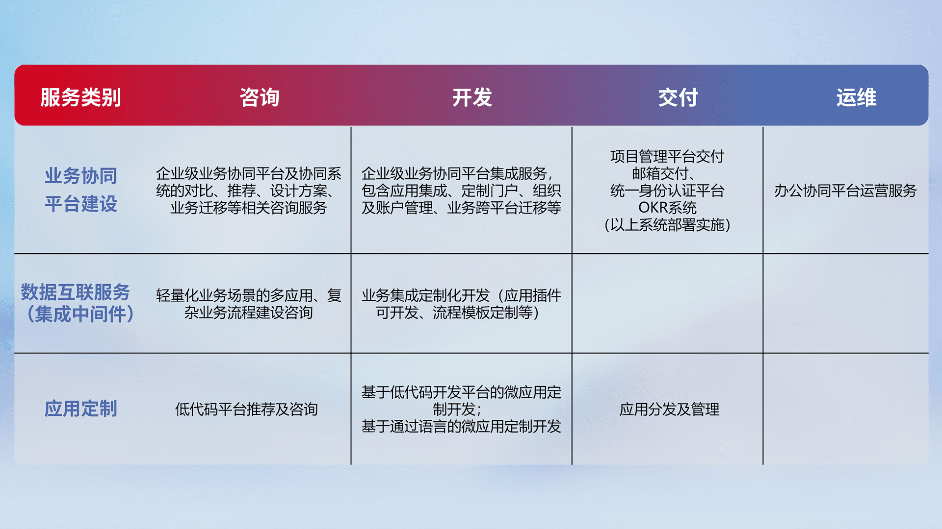 针对钉钉、、企微、、、IDaas等平台级产品提供产品的规划、、、方案、、交付、、定制化开发等服务,,实现如统一协同办公、、智能客户服务、、、混合会议管理、、、、智能数据查询、、、、等业务场景,,,,实现数字化转型。。