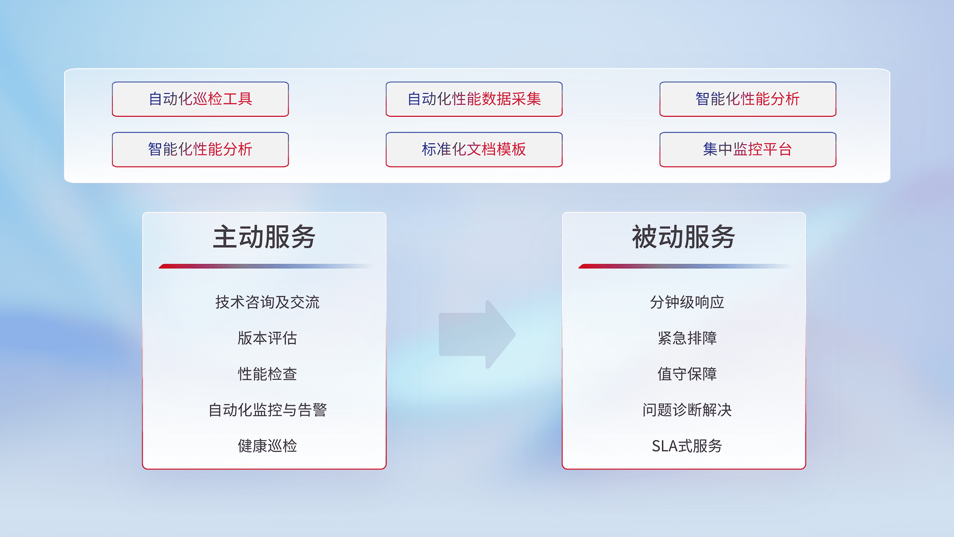 智能化工具和标准化文档,,,,保障服务质量,,提供主动服务(包含技术咨询、、、版本评估、、性能检查、、、自动化监控与告警、、、、健康巡检)和被动服务包含(分钟级响应、、、紧急排障、、值守保障、、、问题诊断解决、、、SLA服务)。。。。