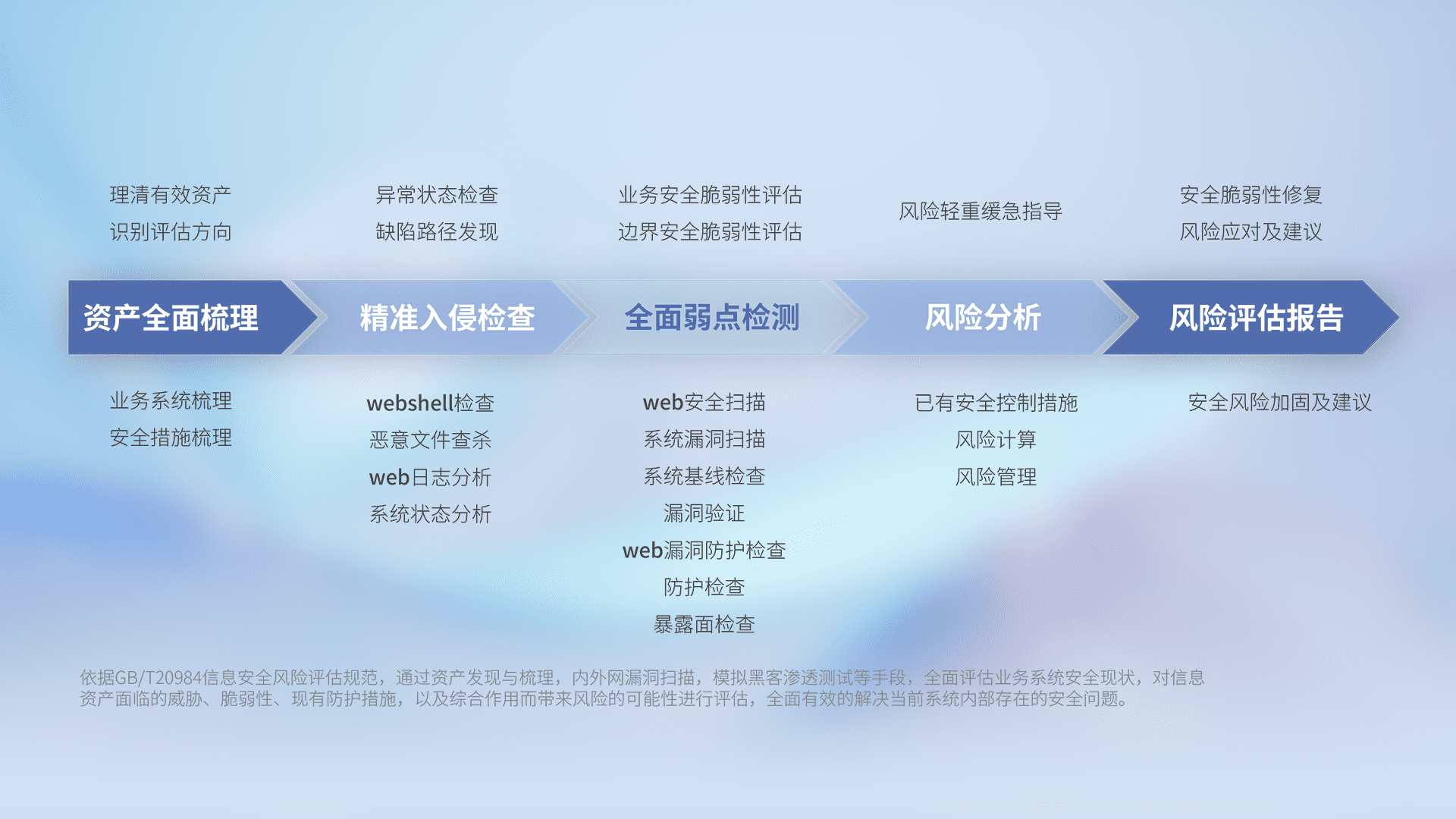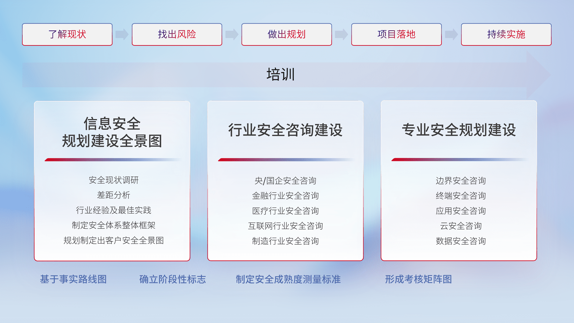 针对客户行业特性,,以专业的安全服务+多厂商联合解决方案提供专属的一站式安全管理服务,,帮助客户全面感知网络空间威胁,,,,基于识别、、检测、、分析、、、防护、、、、监测、、、、响应的服务理论模型,,从方案咨询、、、、集成交付、、、、评估验证、、、优化加固、、、运维运营,,致力于为客户提供完整的闭环管理式安全服务。。。以实战经验为客户打造高抵御风险的安全体系,,,帮助客户发现威胁、、对抗威胁、、、、处置威胁,,不断积累安全对抗能力,,持续保障数字化安全。。。